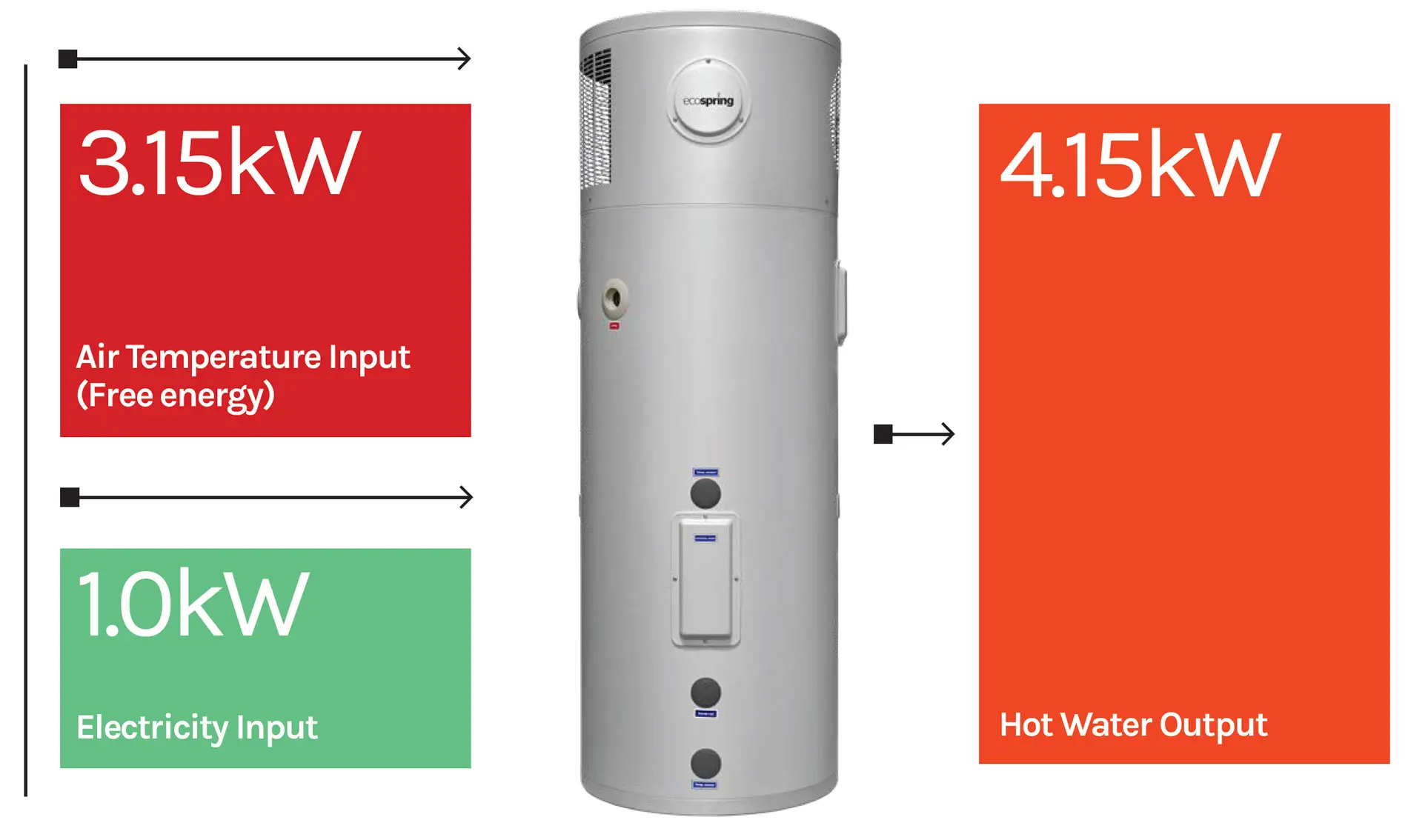 A heat pump is like an energy amplifier. From 1 kW of power input, it can create over 4.15kW of output heat. That’s a remarkable performance efficiency of over 300%. Conventional electric storage water heaters can only convert 1 kW of input power into 1 kW of output heat.