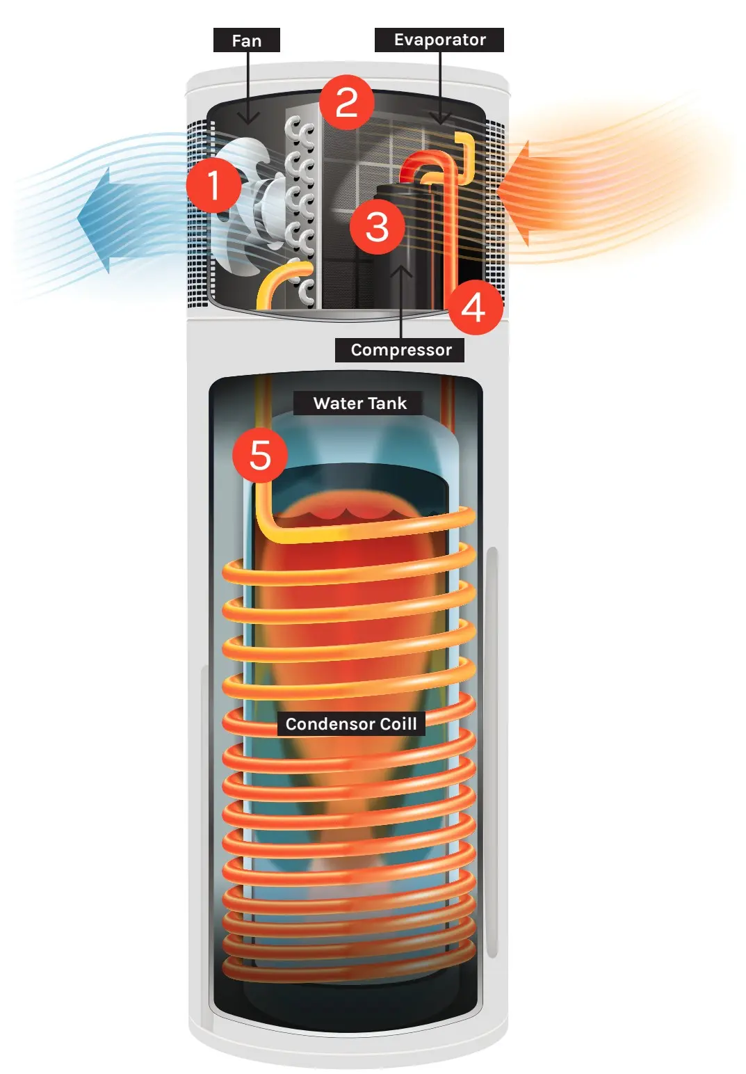 EcoSpring works like magic, only it’s pure physics. A fan draws in air. A refrigerant amplifies the heat. A condenser transfers it to your water tank. And voila – hot water from ambient air.