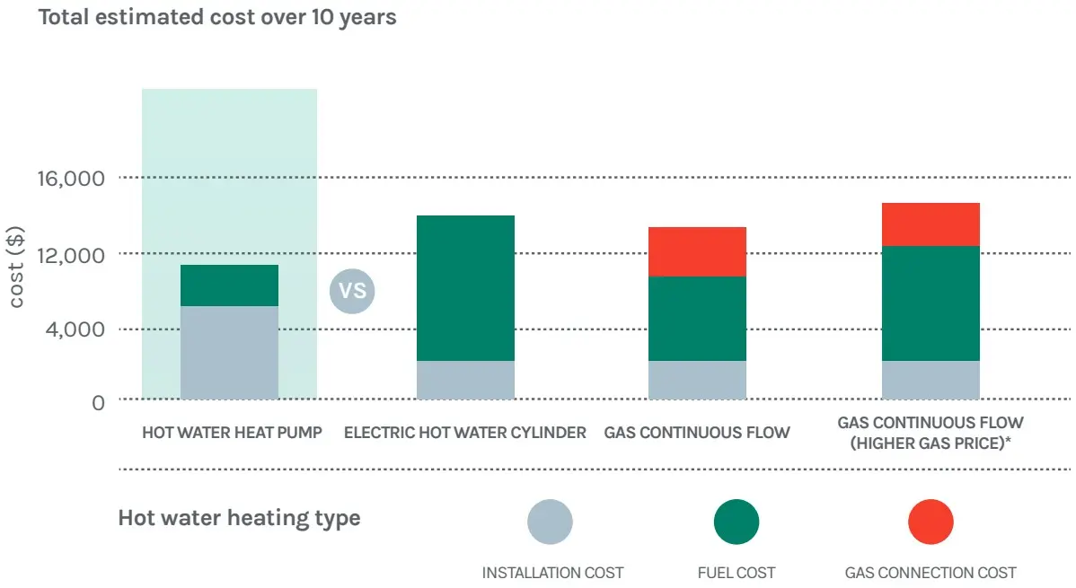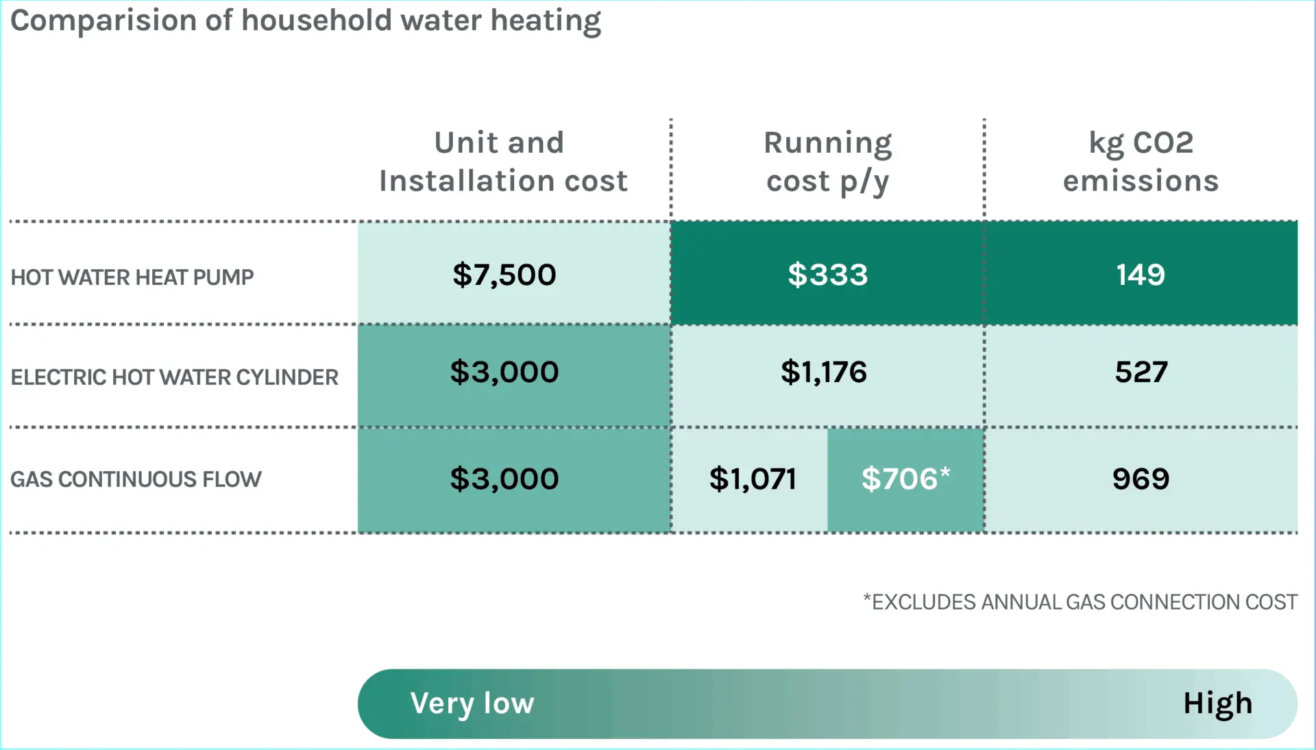 EcoSpring hot water heat pumps are more efficient than natural gas, electric cylinder and LPG options. In fact, EcoSpring running costs are in the league with many solar options..without solar set up costs. Check it out for yourself.